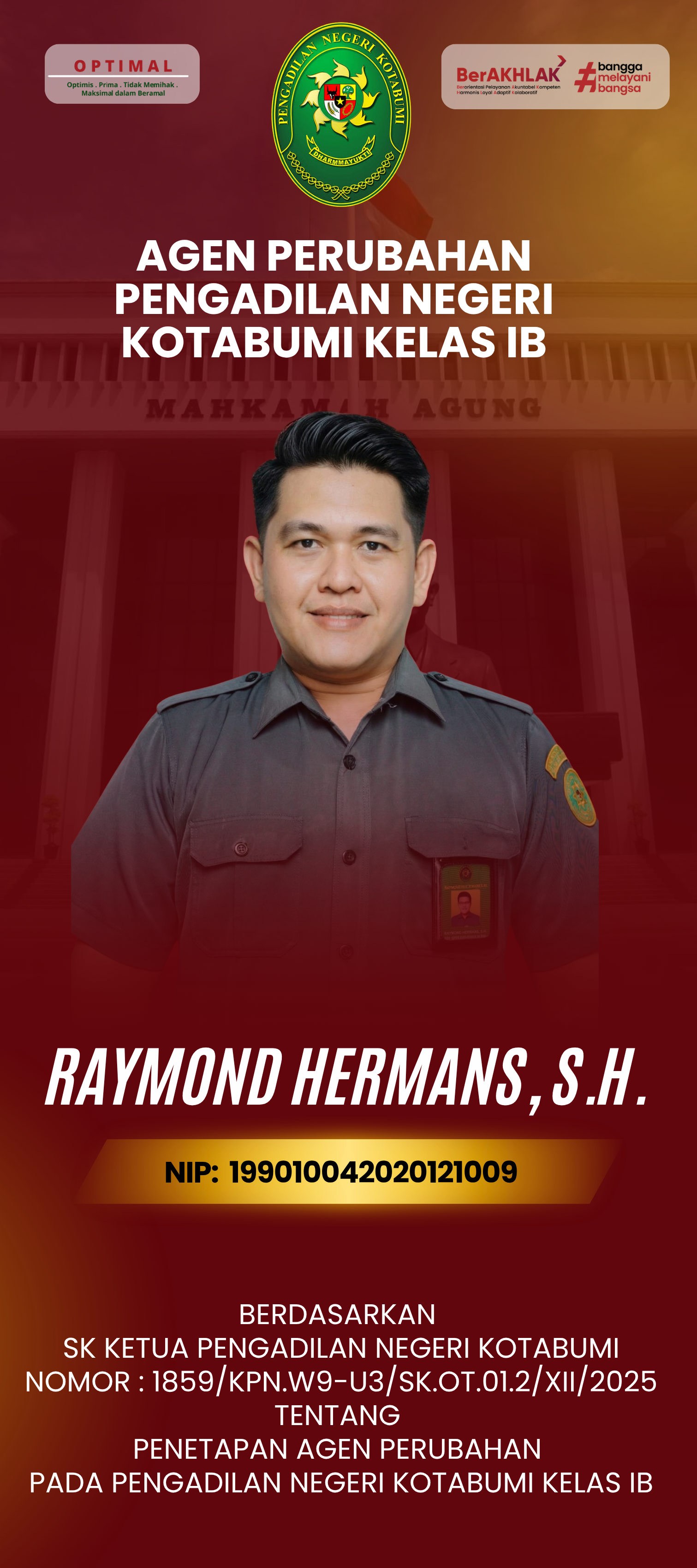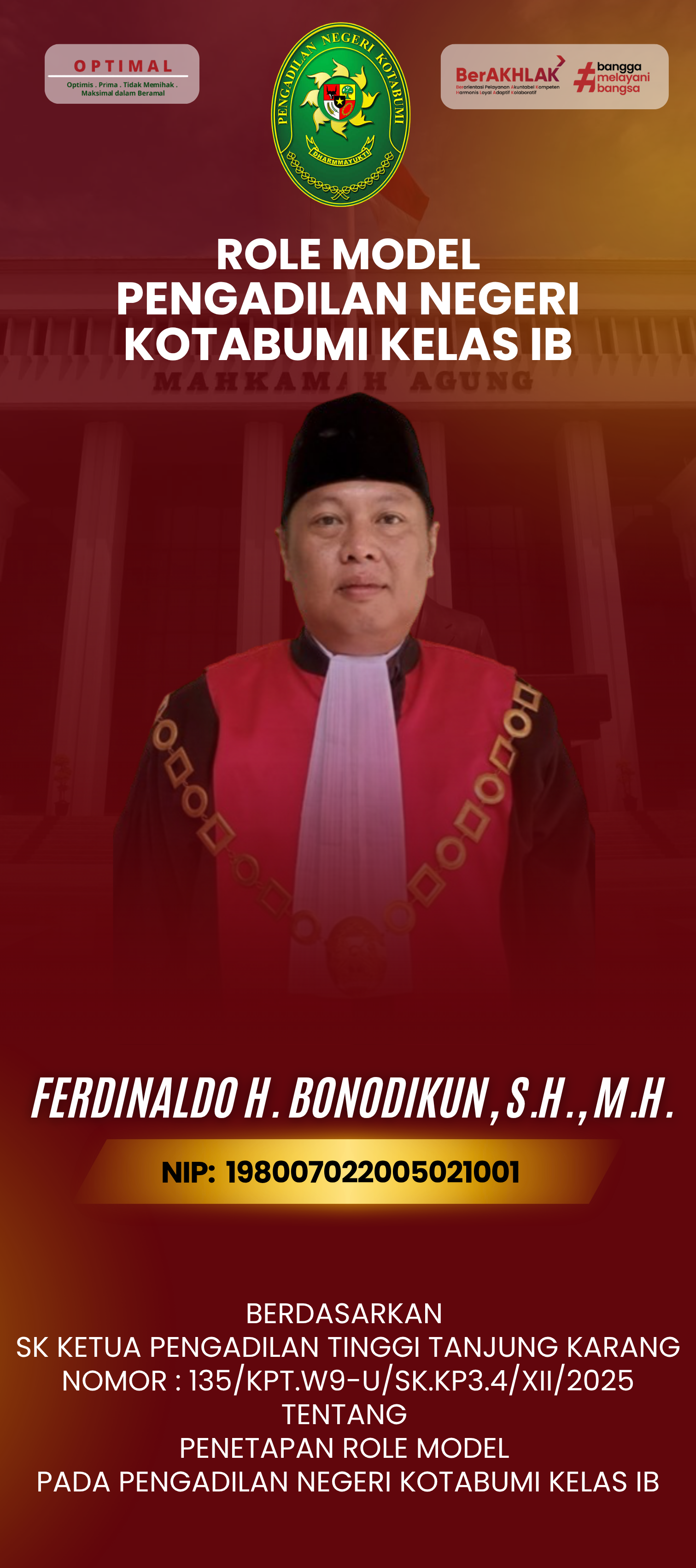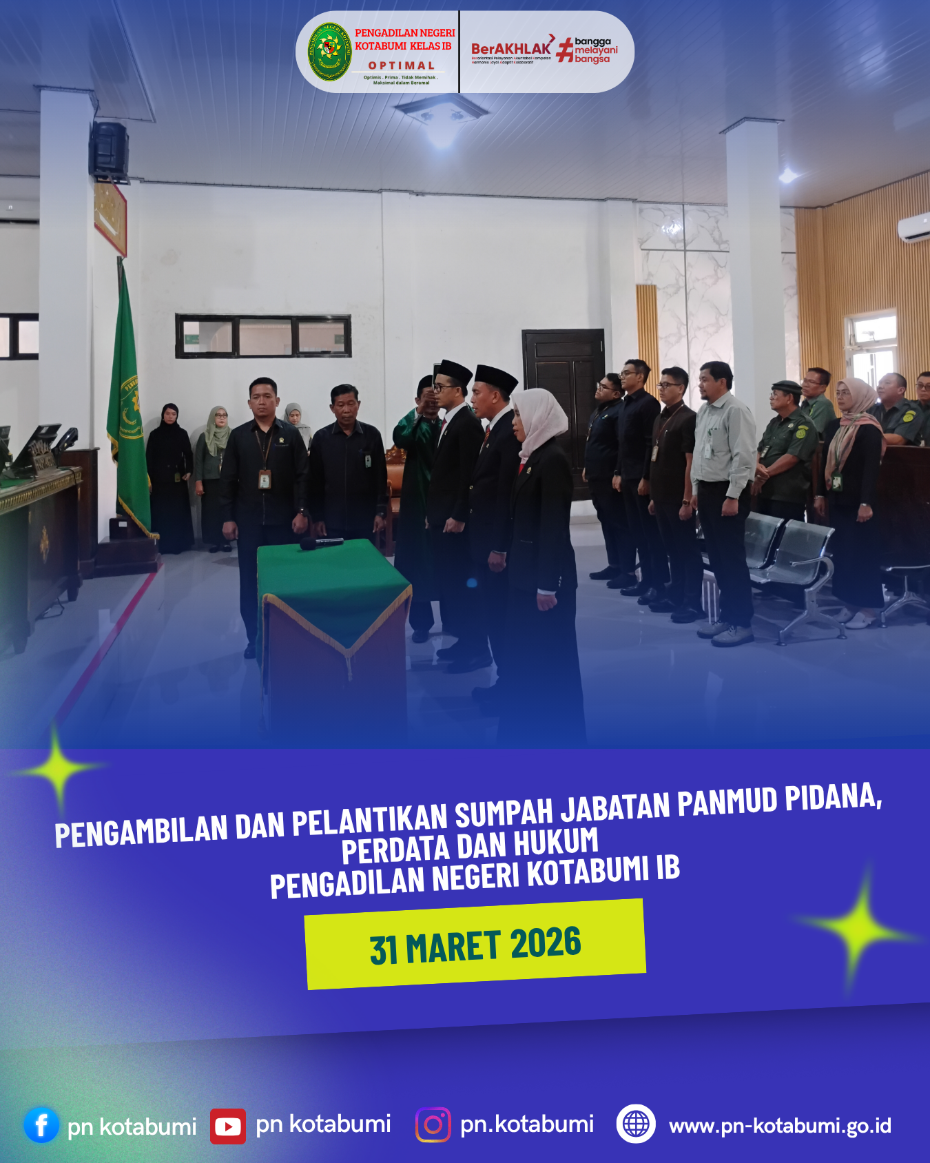 Kotabumi – Bertempat di Ruang Sidang Utama, Pengadilan Negeri Kotabumi Kelas IB melaksanakan kegiatan Pengambilan Sumpah Jabatan dan Pelantikan Pejabat Struktural. Upacara yang berlangsung khidmat ini dipimpin langsung oleh Ketua Pengadilan Negeri Kotabumi, Bapak Ferdinaldo Hendrayul Bonodikun, S.H., M.H. (31 Maret 2026).