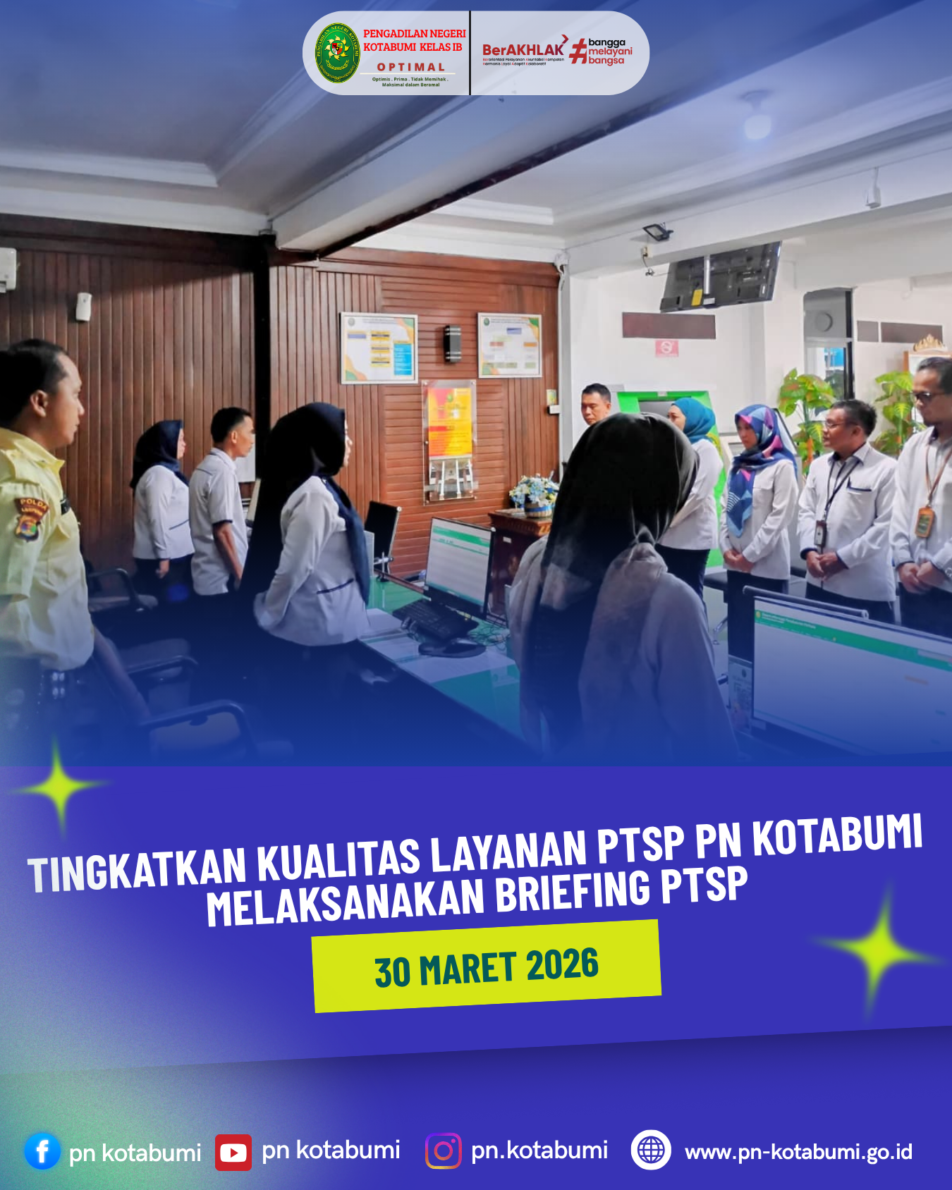 Kotabumi – Dalam upaya menjaga konsistensi pelayanan publik yang prima, Pengadilan Negeri Kotabumi kembali menyelenggarakan kegiatan Briefing Pagi bagi seluruh petugas Pelayanan Terpadu Satu Pintu (PTSP). Kegiatan ini dipimpin langsung oleh Hakim Pengawas Bidang PTSP, Ibu Nur Kastwarani Suherman, S.H., M.H. (30 Maret 2026).