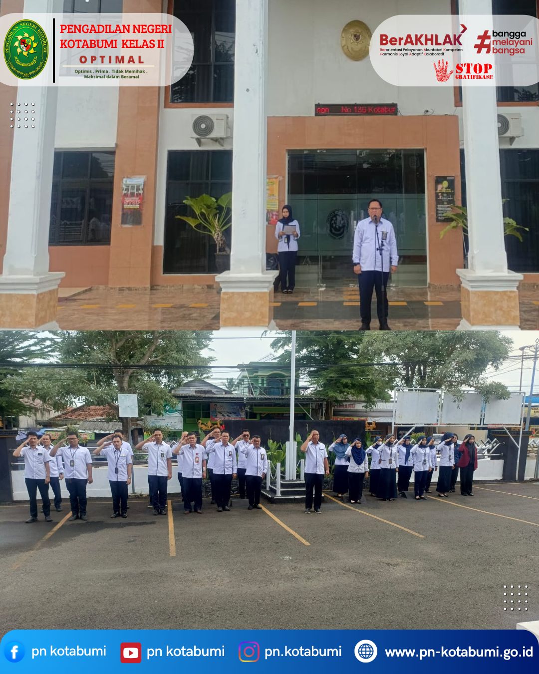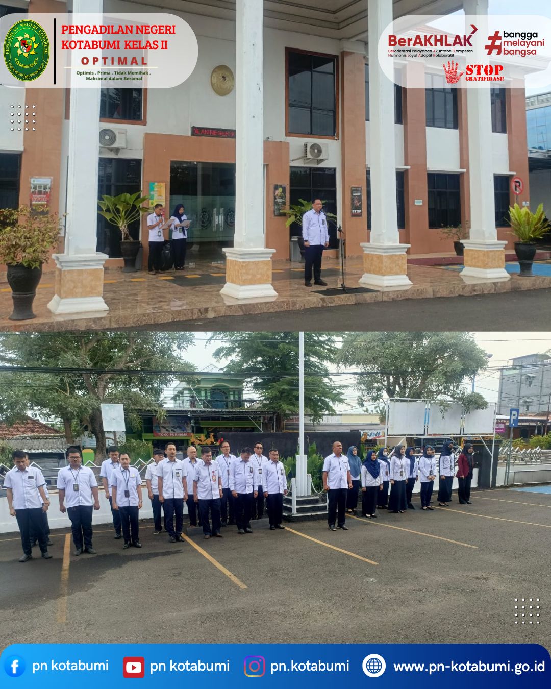Kegiatan apel berjalan dengan tertib dan khidmat, serta diikuti oleh, Jajaran Hakim, Sekretaris, Pejabat Struktural dan Fungsional, serta seluruh Pegawai Pengadilan Negeri Kotabumi.