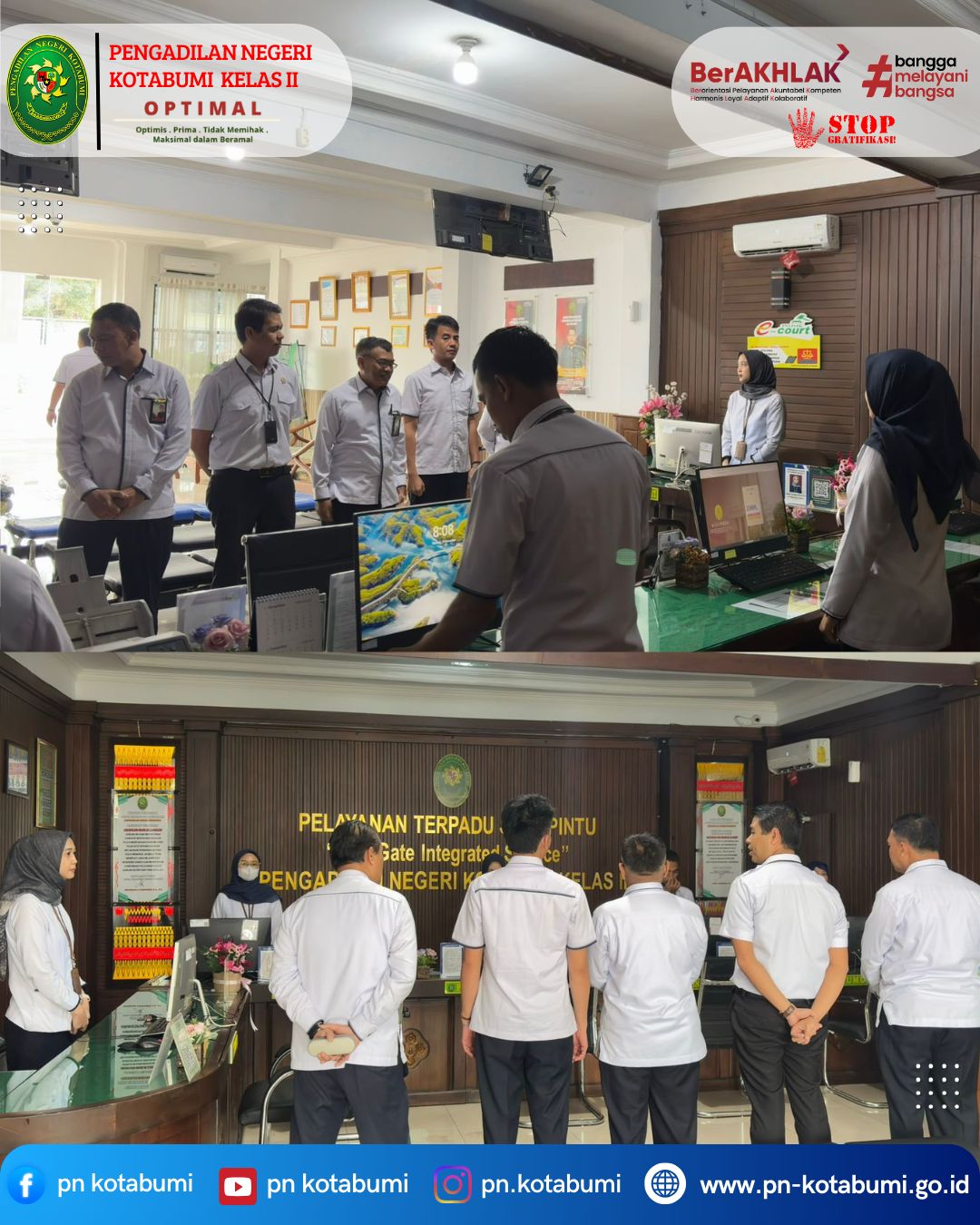 Briefing Petugas PTSP PN Kotabumi, dipimpin oleh Hakim PN Kotabumi, yang mengingatkan kepada petugas PTSP untuk meningkatkan kualitas pelayanan, terus menjaga integritas dan memberikan pelayanan dengan senyum, salam, sapa, sopan, dan santun.