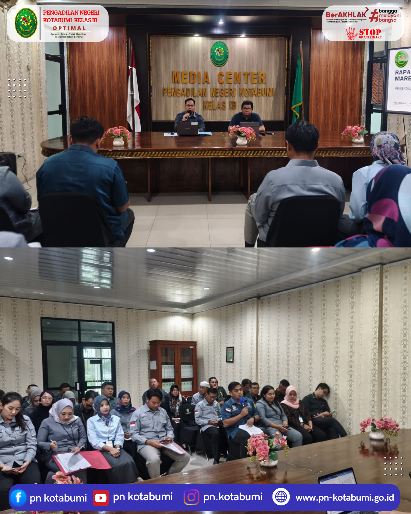 Kegiatan yang berlangsung di Ruang Media Center PN Kotabumi ini dihadiri oleh Ketua, Wakil Ketua, para Hakim, Panitera, Sekretaris, serta seluruh pegawai.